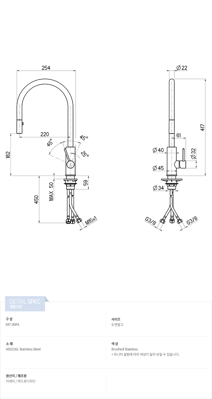22mm PULL-OUT / 2 JETS SPRAY SHOWER / SWIVEL 토수구 적용 1홀 주방수전