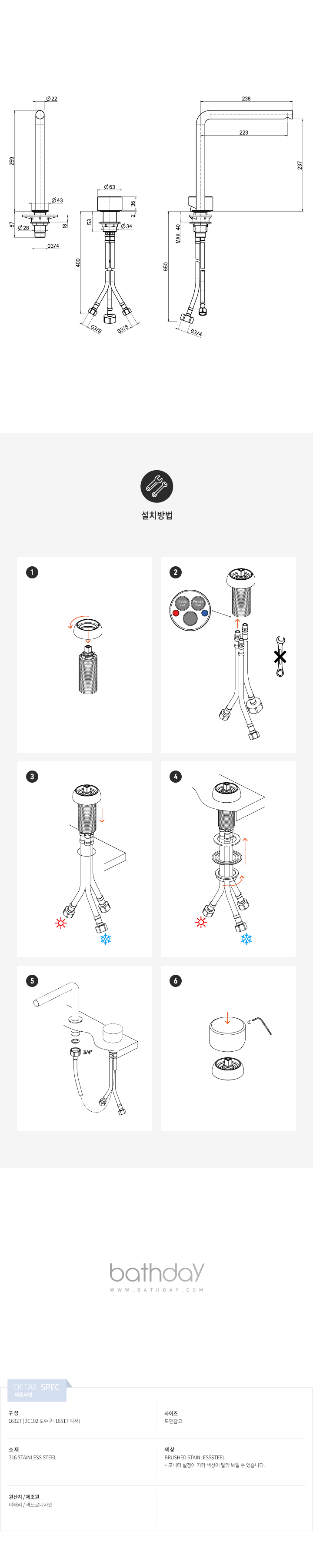 스테레오 2홀 기역자 스테인레스 높은세면수전 1632T 카트리지 방식